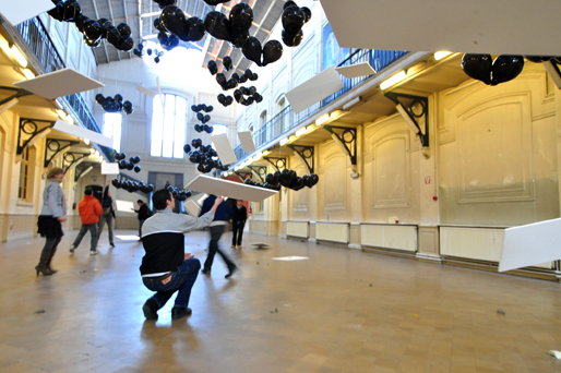 Le processus de Layer prend son effet tout au long du temps d’exposition. Les caractéristiques intrinsèques de l'hélium font que les ballons se dégonflent au fur et à mesure pour atterrir au sol. Le mouvement qui s’en suit est aléatoire, produisant ainsi une nouvelle lecture de l'espace architectural.