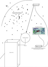 En ce qui concerne l’antenne parabolique, elle métamorphose un ‘topos’ du réseau Internet. Si j’ai choisi la parabole, c’est pour la métaphore qu’elle suscite. Et surtout parce que dans un futur proche, c’est par cette technologie que le réseau sera désengorgé. De plus elle crée une cartographie en temps réel. Grâce au projecteur (relié lui-même au moniteur 16/9 et au lecteur DVD), qui projette sur la face concave de la paraboe. Cet objet crée une projection fragmentée de la vidéo à l’instar des informations parcélisées qui circulent dans l’espace du réseau.